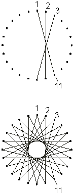 achterlangs De verkorte beschrijving hiervan gaat als volgt; 1-11 (11-12) 12-2 (2-3) 3-13 enz. Ga zo steeds een gaatje rechtsom verder. Op een gegeven moment moet je de gaatjes voor de tweede keer gebruiken. Borduur net zolang verder totdat de figuur “vol” is.
