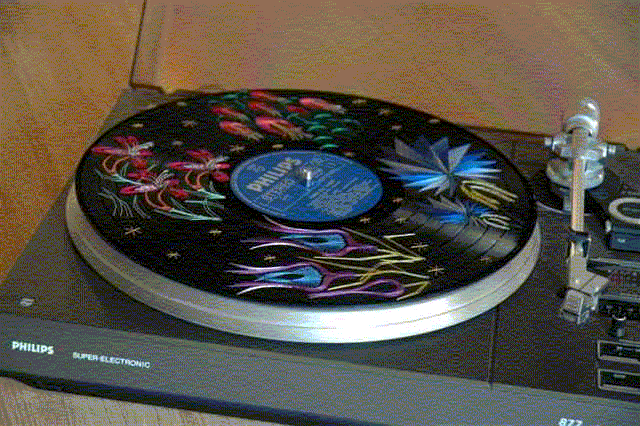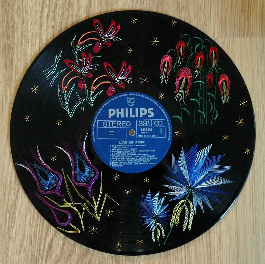 Embroidery on records. Embroidery on records is very special and beautiful Look at examples below. The working method is the same as "embroidery on cd" look on: "cd procedure" After embroidery we advice you to put some glue on the threads at the backside of the record, because in time the tape you have used can possible come lose. |