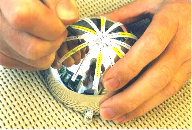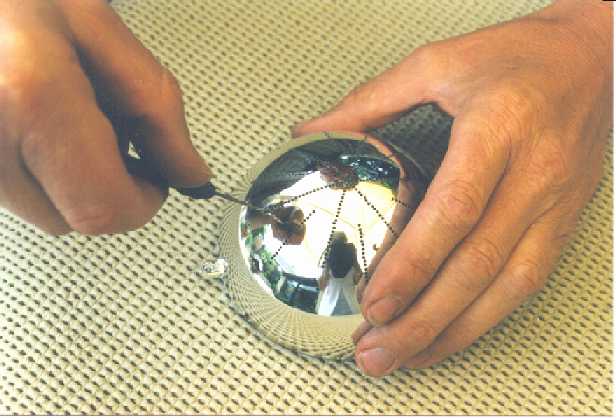work instruction Buy a chromium ball, which exist of two plastic halves that can fix together. We have found one in a store by accident. Cut the pattern into small ribbons, see also the first picture below. Glue this with "post-it" adhesive on the ball-half. "Post-it" adhesive is easily to remove from the ball-half but it is solid enough to keep the pattern on his place during the prick process. Now you prick the pattern over into the ball-half by means of butt pin exactly on the black points from the pattern. Remove the pattern and drill all the indentations by means of a drill of 1 mm.(second picture) Finally you have to smoothen the holes (third picture) Embroider the pattern just like a card, follow the description.