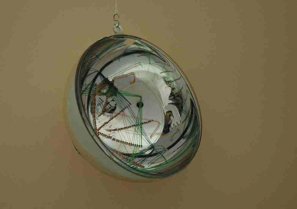 It was very difficult to realize the animation because of the reflection into the ball. Finally we succeed by making a tent of bet sheets, in front of our computer. In these tent we hung the Christmas ball. In the reflection off the ball you can see the stand with the web cam. |